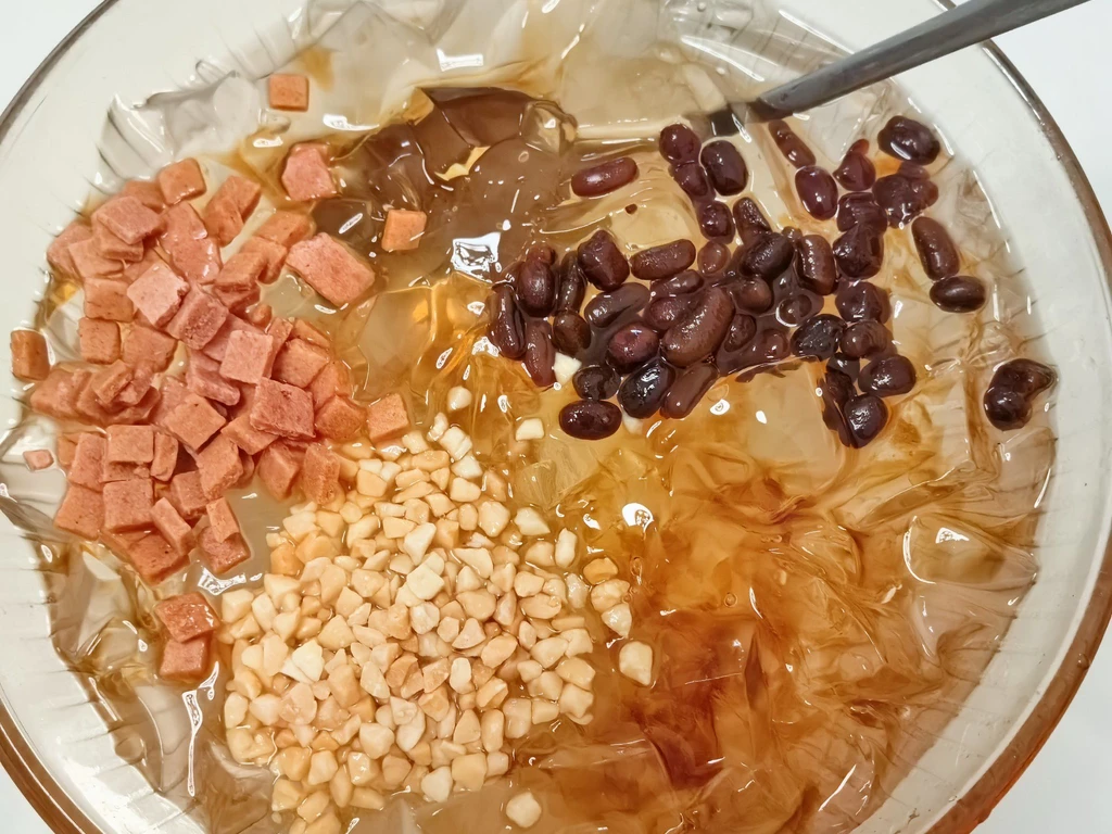 Bingfen (Chinese: 冰粉; pinyin: bīngfěn), also called ice jelly, is a Chinese dessert native to Southwest China in provinces such as Sichuan, Guizhou, and Yunnan. It is served as a bowl of iced transparent jelly, traditionally made from the seeds of the Nicandra physalodes plant. In modern times, bingfen can also be made from konjac root. The jelly can be topped with toppings like haw flakes and wolfberries. It is commonly sold in the summertime as a street food. -- https://en.wikipedia.org/wiki/Bingfen